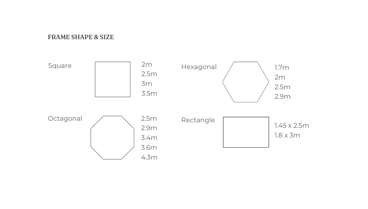 - Octagonal: 2.5m, 2.9m, 3.4m, 3.6m, 4.3m